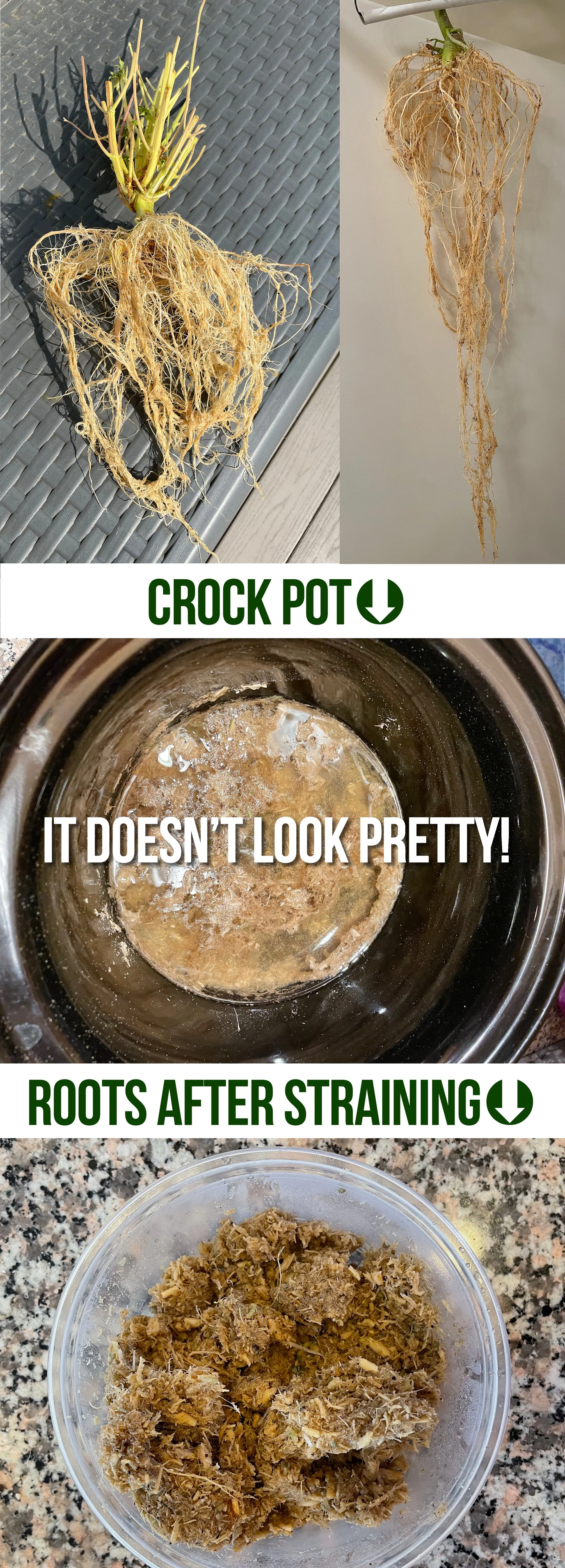 Using organic, non-refined coconut oil such as Nutiva (link below), empty the full jar into the crock pot. I used a 15 oz jar for two root systems. Add about a cup of water so that the coconut oil doesn’t burn. Then add the ground up roots. Cook on low setting and let this simmer for at least 8 hours. I usually do 12+. During this time the cannabis infuses into the coconut oil. You can check it during the course of the cook to make sure it isn’t burning and that there is enough water. As shown, it doesn’t look pretty!.
